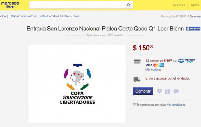 El hombre ofrece a través de Mercado Libre a quien le de empleo una ubicación para la definición de la Copa Libertadores que mañana disputarán San Lorenzo y Nacional de Paraguay.